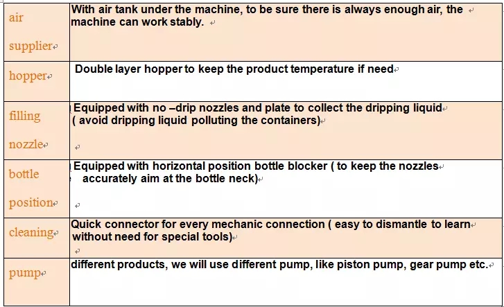 เครื่องนี้ทำขึ้นเป็นพิเศษสำหรับความหนืด / ของเหลวทุกชนิดในอุตสาหกรรมอาหาร, อุตสาหกรรมเคมีและ comodity เช่นน้ำมันเครื่อง, น้ำมันเครื่อง, สลัด, เจลล้างมือ, น้ำมันมะพร้าว, ซอสถั่วเหลือง, งา, แชมพู, สบู่เหลว, น้ำมันเครื่อง , น้ำมันเบรก, น้ำมันปรุงอาหาร, ซอสมะเขือเทศ, เครื่องดื่ม, น้ำมันหอมระเหย, น้ำมันพืช, น้ำผึ้ง, ซอสพริกไทย, เนยถั่วลิสง, โยเกิร์ต, น้ำผลไม้, เครื่องดื่มและอื่น ๆ ทุกส่วนที่สัมผัสกับของเหลว / ซอสเป็นสแตนเลสคุณภาพสูง adopts ปั๊มลูกสูบสำหรับการกรอกโดยการปรับตำแหน่งปั๊มมันสามารถเติมขวดทั้งหมดในเครื่องบรรจุด้วยความเร็วและความแม่นยำสูง