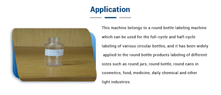 เครื่องนี้เป็นของเครื่องติดฉลากขวดกลมซึ่งสามารถใช้สำหรับการติดฉลากเต็มรอบและครึ่งรอบของขวดกลมต่างๆและมันถูกนำมาใช้กันอย่างแพร่หลายกับผลิตภัณฑ์ขวดรอบการติดฉลากที่มีขนาดแตกต่างกันเช่นขวดกลมขวดกลม , กระป๋องกลมในเครื่องสำอาง, อาหาร, ยา, เคมีรายวันและอุตสาหกรรมเบาอื่น ๆ ส่วนประกอบอุปกรณ์: ตู้ไฟฟ้า, กลไกการลำเลียง, อุปกรณ์ขวดแยก, อุปกรณ์กลิ้งฉลาก, อุปกรณ์ฉลากแปรง, เครื่องยนต์ฉลาก 1, ระบบปฏิบัติการและระบบควบคุม